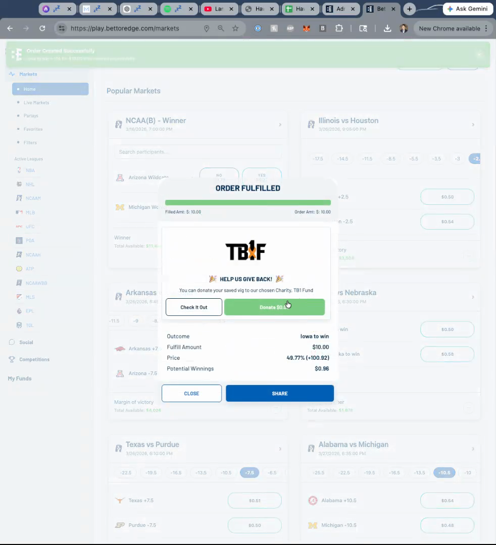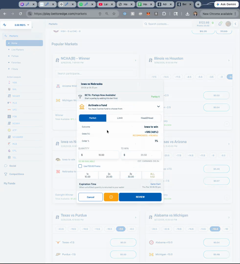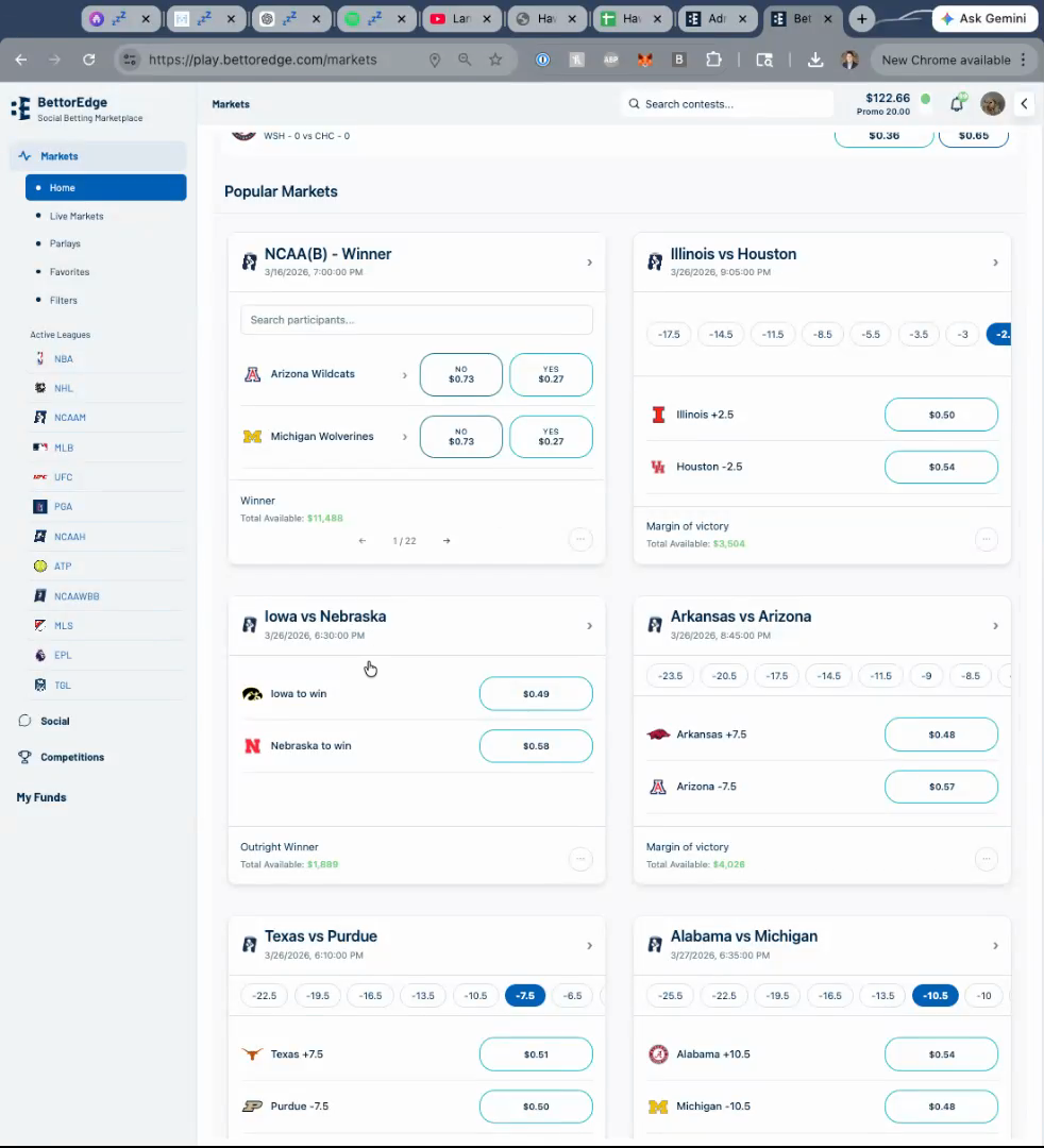 Navigate to the BettorEdge market you want to trade. In this example, the market is the NCAA Basketball Winner board.