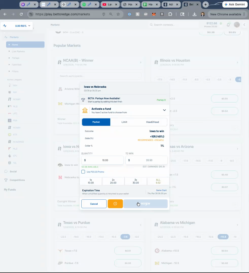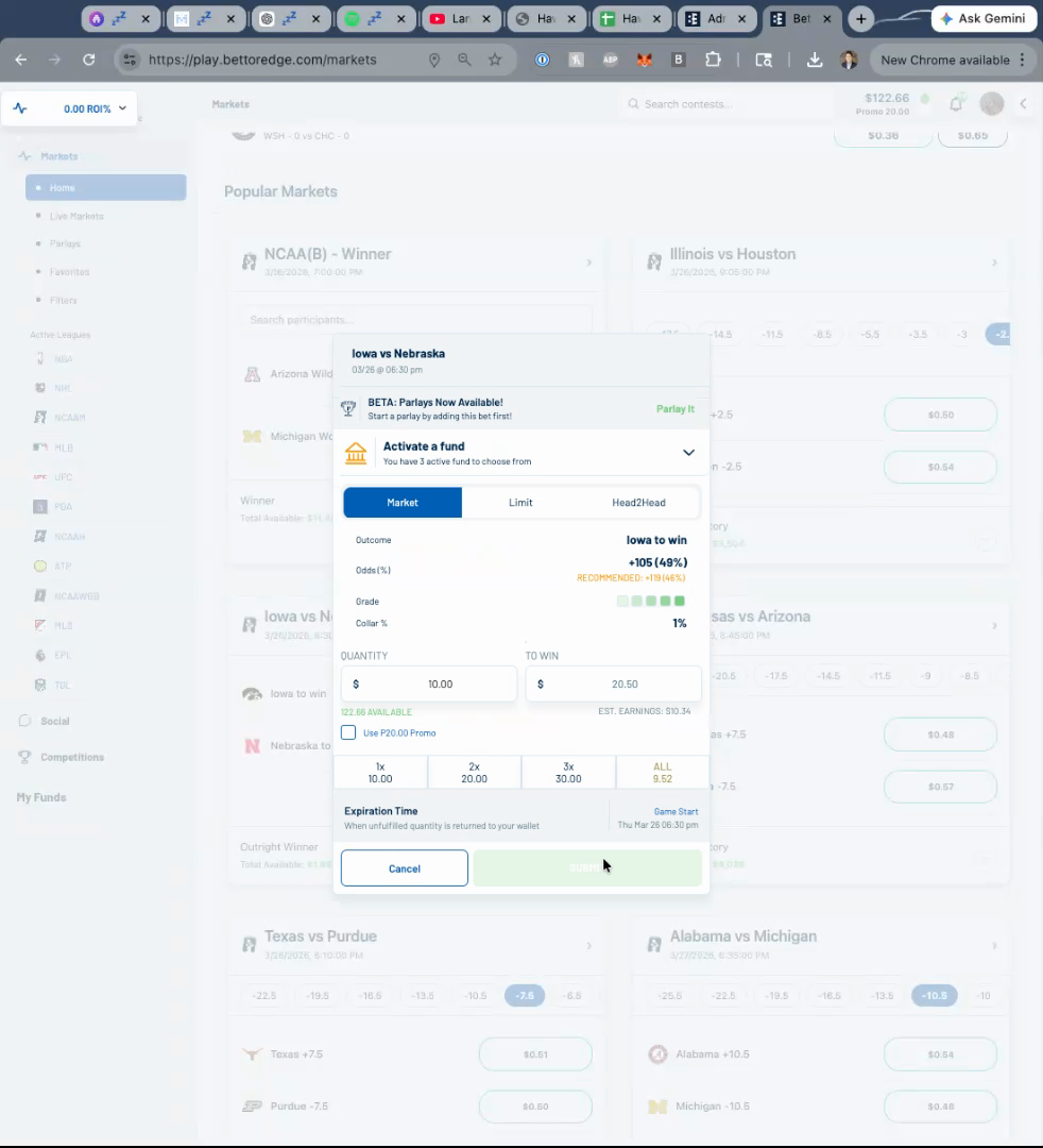 Learn how to place a bet on BettorEdge using a market order, which takes the current available price instead of setting your own.